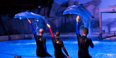 Go on a discovery adventure with our caretakers. Marvel at our animals from the first row! First, you’ll see a presentation in the sea lion theatre. Afterwards, you’ll visit the dolphinarium. During this performance, you’ll learn about the lives of dolphins and sea lions in a fun way. We’ll also teach you about marine mammals in general. You’ll not only learn about their life here in the dolphinarium, but also about their life in the wild. Our team’s pedagogical training means that this educational, interactive performance guarantees an excellent teaching package that aligns with the official curricula.